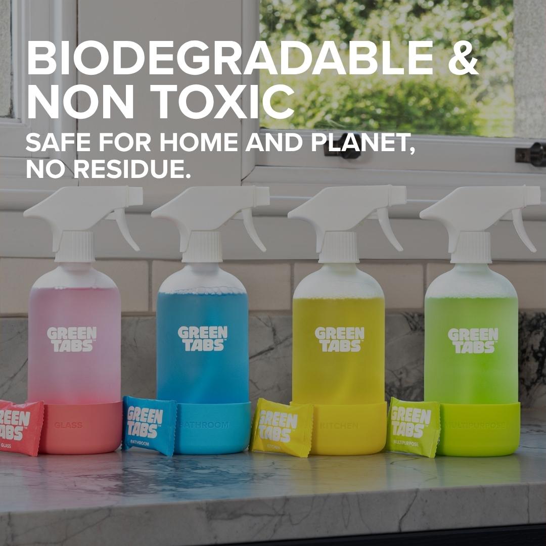 expand_moreCleaning Spray GreenTabs™ are your complete eco cleaning solution for every room, made with plant‑powered, non‑toxic ingredients. Tackle grease, limescale, grime, and dirt on glass, kitchen, bathroom, and multipurpose surfaces – no harsh chemicals, synthetic fragrances, or single‑use plastic bottles.