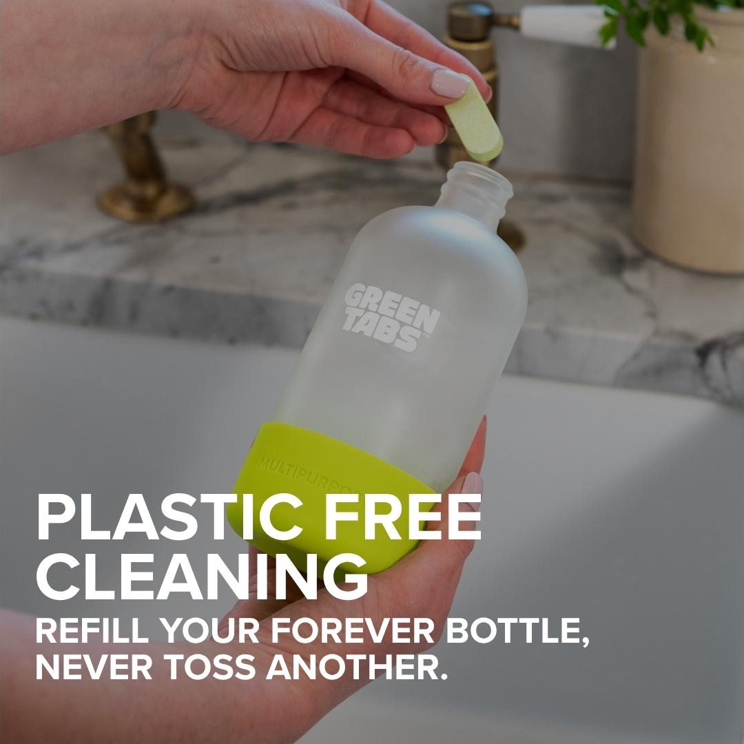 Drop, Fill, Spray. Drop one GreenTab™ into your reusable spray bottle, fill with warm water, and let it dissolve. Shake gently and get cleaning—powerful on grease and grime, gentle on the planet.